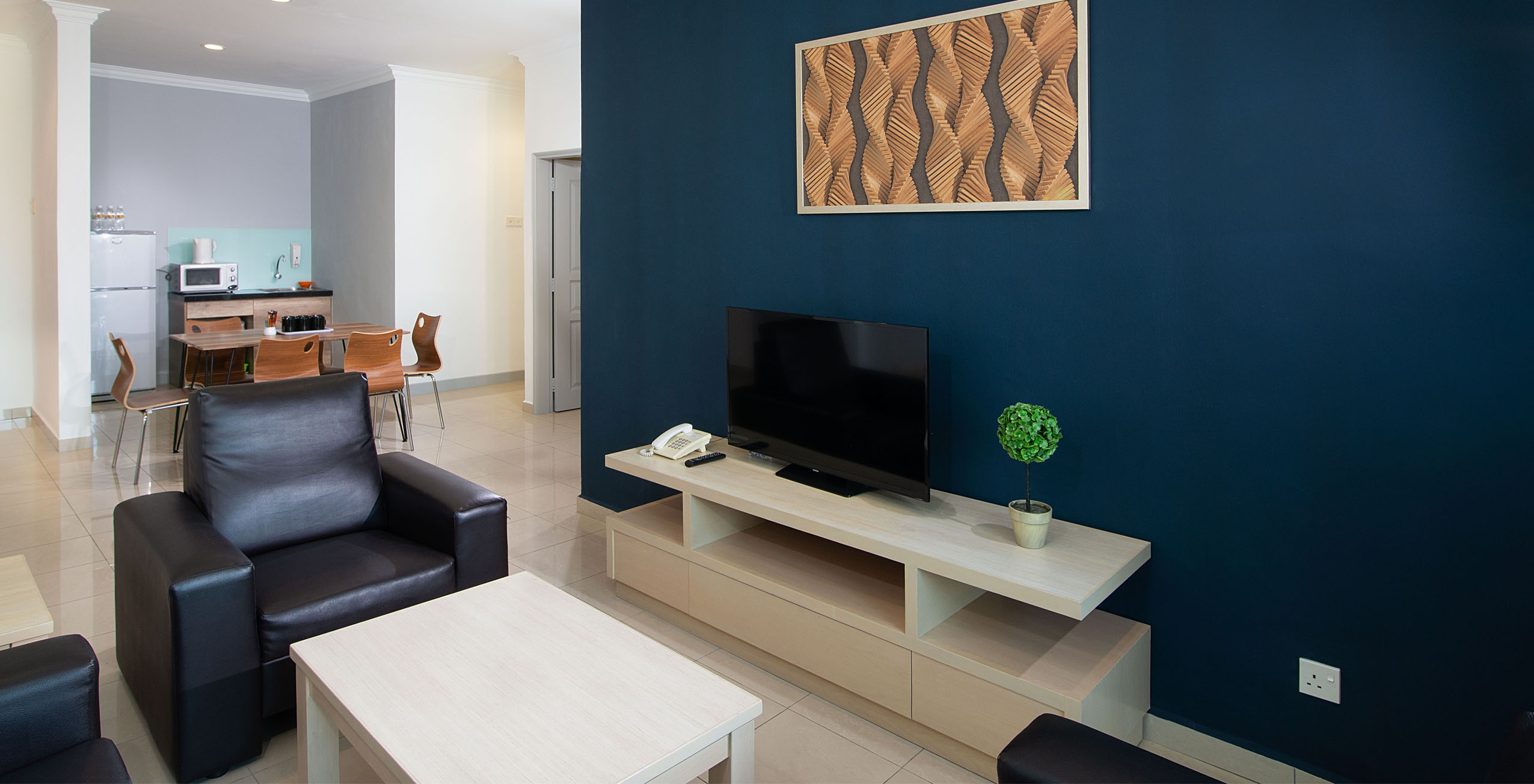 - Dapur kecil dilengkapi dengan meja makan beserta kursi makan, kulkas, microwave, teko untuk membuat teh dan kopi, peralatan makan dan perkakas dapur.